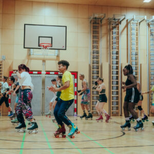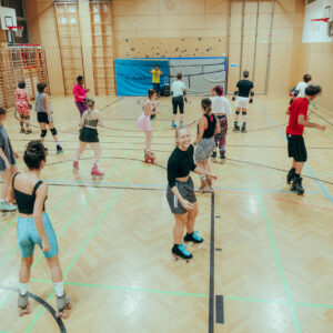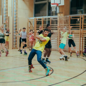 Offene Skate-Session für alle Workshop-Teilnehmer*innen. Powerjam sorgt für die Grooves und ein bisschen Disco-Feeling in der Trainingshalle. 😉
